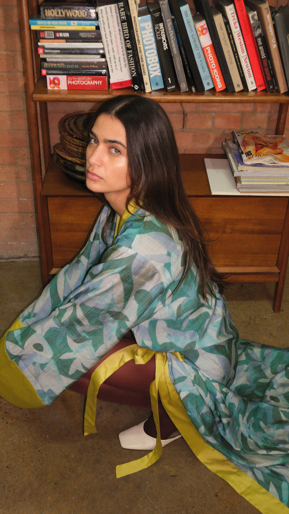 Lightweight 100% cotton kimono featuring chartreuse detailing and a soft botanical print, perfect for lounging, travel, or layering.
